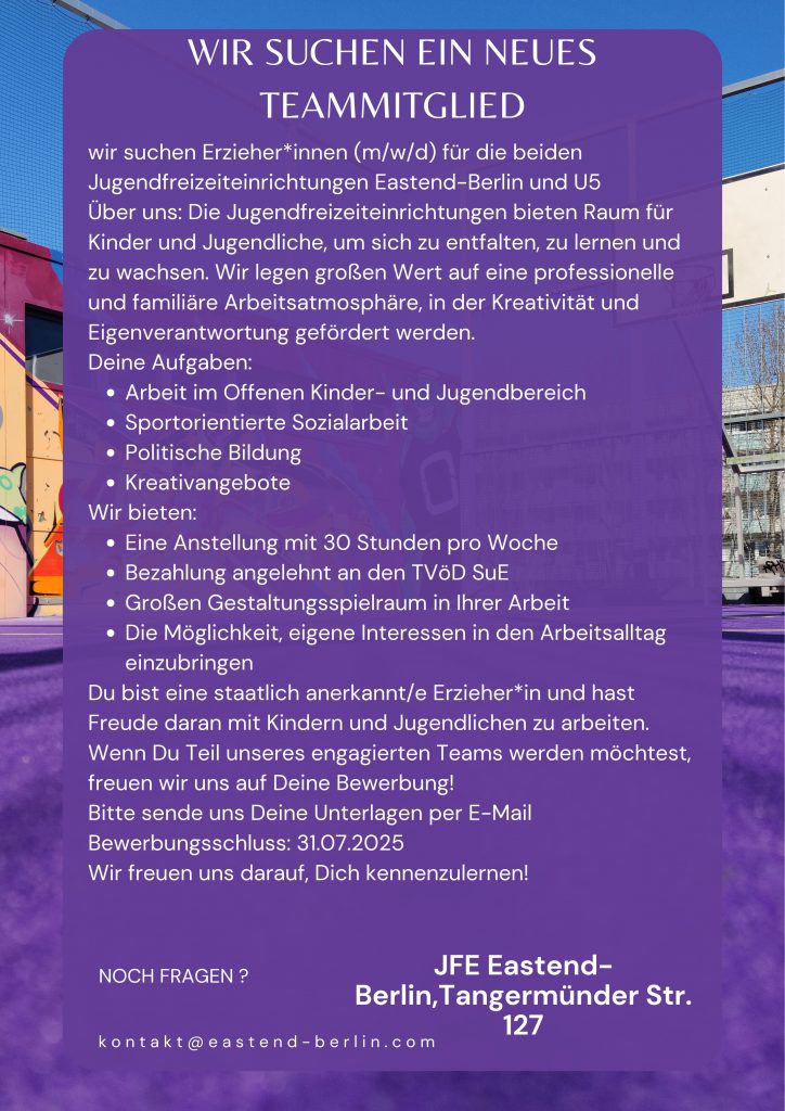 wir suchen eine Erzieher*in (w/d) für die Jugendfreizeiteinrichtung Eastend-Berlin
